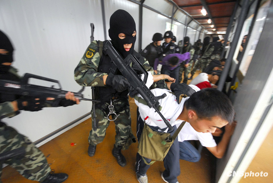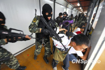 10月23日下午3時40分,推進“平安重慶”建設突發事件應急演練在該市渝中區大田灣體育場舉行,重慶各警種突精銳力量重裝登場,將各類事件一一化解。圖為反劫持戰術演練中,武警特種作戰分隊、特警總隊突擊分隊發起攻擊,一舉捕殲了“恐怖分子”。 中新社發 郝飛 攝