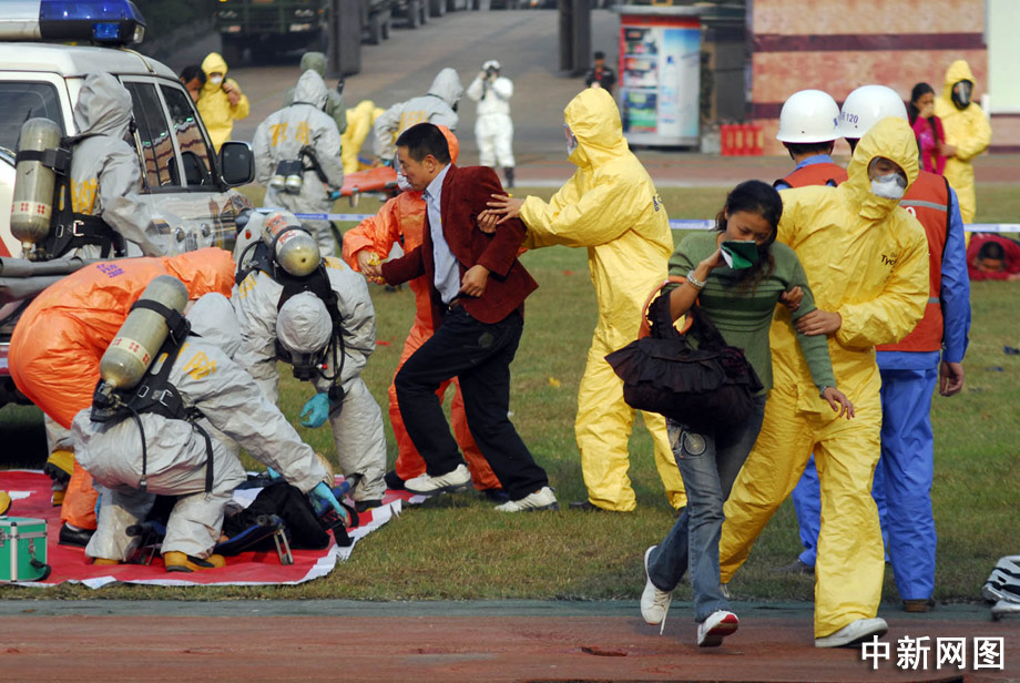 緊隨其后進(jìn)場(chǎng)的是防化醫(yī)學(xué)救援隊(duì)。該分隊(duì)指揮員帶領(lǐng)后續(xù)偵察分隊(duì)、洗消分隊(duì)和化驗(yàn)組,分別乘坐4輛防化偵察車、1輛淋浴車和1輛防化化驗(yàn)車入場(chǎng)。穿藍(lán)色和橙色防護(hù)服的防化醫(yī)學(xué)救援隊(duì)入場(chǎng)后,醫(yī)療衛(wèi)生人員迅速展開裝備,組織檢驗(yàn)監(jiān)測(cè),開設(shè)臨時(shí)醫(yī)療所,區(qū)分觀察區(qū)、檢診區(qū)、洗消區(qū)和處置區(qū),救護(hù)車開始中毒人員轉(zhuǎn)運(yùn)。 郝飛 攝