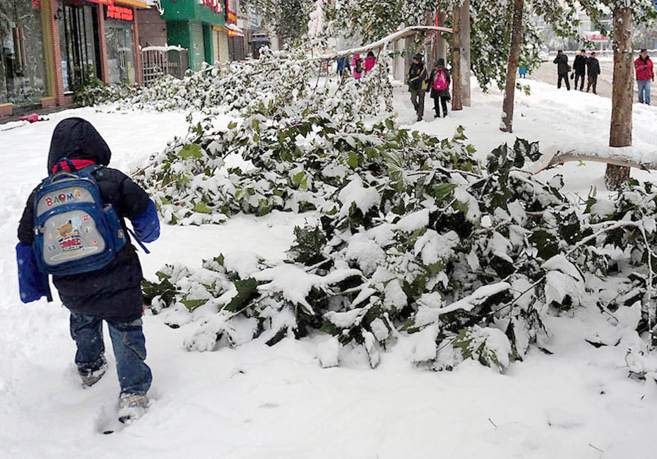 11月12日,一位上學的兒童從一棵被大雪壓倒的梧桐樹旁走過。 連日來,暴雪不斷襲擊鄭州。大雪給鄭州的交通和群眾生活造成了嚴重影響。 王頌 攝 (來源:新華網)
