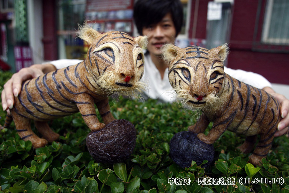 11月9日,北京一位時(shí)尚發(fā)型設(shè)計(jì)師正在展示頭發(fā)絲作品“;⑸裢辟R歲虎年。這是祖國60華誕之后的又一新作,四川青年理發(fā)師黃鑫用2.6公斤碎頭發(fā)制作了一對(duì)可愛逼真的“福虎”,歷時(shí)兩個(gè)多月的時(shí)間才完工。>>點(diǎn)擊觀看詳細(xì)內(nèi)容