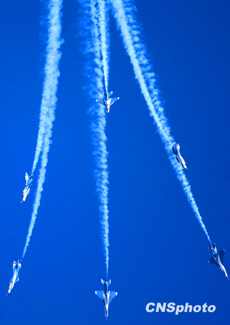 慶祝中國人民解放軍空軍成立60周年飛行表演,11月15日上午在北京沙河機場舉行。表演按八一飛行表演隊4架殲-10飛機表演12個動作和6架殲-7GB飛機表演15個動作,分四機對頭交叉、四機菱形隊大坡度盤旋、單機小速度平飛等27個動作,其中四機對頭交叉動作是這次表演中技術難度較大的動作之一,這是國產三代飛機和國產二代飛機首次同場競技表演。圖為殲-7GB表演六機向下開花。中新社發 宋吉河 攝