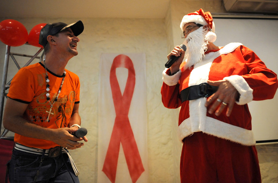 圖為哥倫比亞一位“圣誕老人”在為艾滋病日做宣傳。12月1日是世界艾滋病日,2009年世界艾滋病日的主題是“普遍可及和人權”。世界各地民眾組織各種活動呼吁人們關注艾滋病。圖片來源:中國新聞網