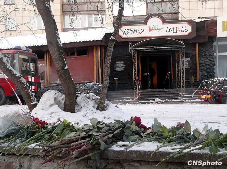 十二月六日,俄羅斯彼爾姆市民眾自發(fā)來到夜總會火災(zāi)事故現(xiàn)場,悼念遇難者。圖中紅色建筑即為失火夜總會。中新社發(fā) 田冰 攝