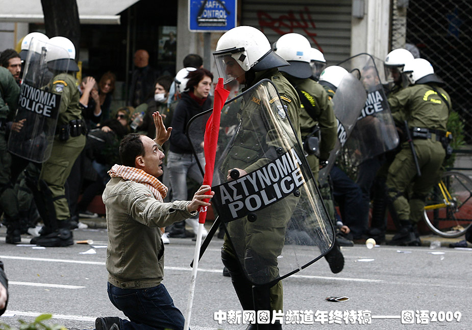 12月6日,一名抗議者在警察面前下跪。雅典警察開槍打死一名15歲少年事件一周年,希臘各地舉行悼念活動和爆發游行示威。