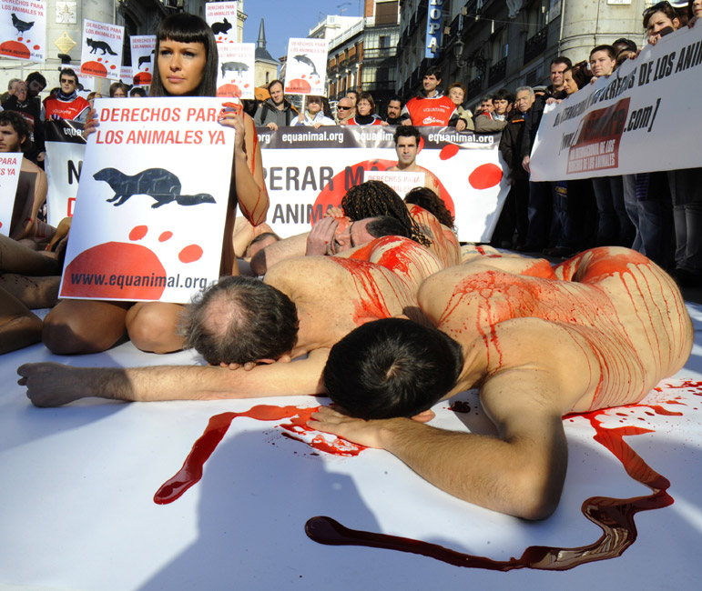 12月12日,動物保護組織的活動者在身上涂上紅色顏料,赤身裸體地躺在西班牙馬德里的街道上,抗議捕殺海豹。
