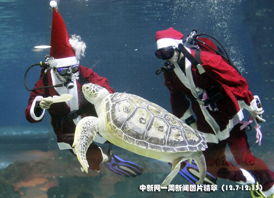 13日(周日),在韓國首爾的水族館,兩位飼養員身著圣誕老人的服飾在水中與海龜“同游”。圖片來源:中國新聞網