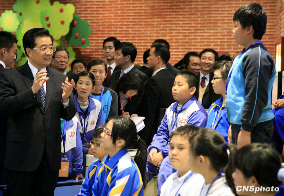 12月19日下午,國家主席胡錦濤在澳門特首何厚鏵陪同下參觀澳門科學館,并與當地學生親切交流。中新社發 張勤 攝