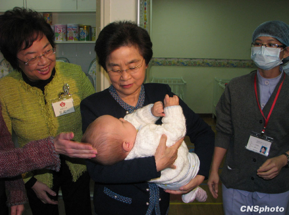 12月19日下午,國家主席胡錦濤的夫人劉永清參觀澳門母親會托兒所時,抱起一名不足一歲的嬰兒。中新社發 于晶波 攝