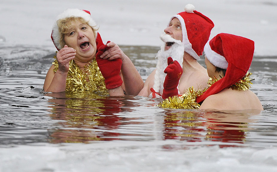 12月25日,德國柏林的冬泳俱樂部“柏林海豹”(Berliner Seehunde)的成員不畏寒冬,光著身子在已經結冰的Oranke湖中暢游一番。圖片來源:中國新聞網