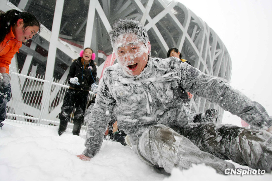 1月3日,北京城降下大雪,北京地區氣溫逼近40年來的歷史低溫極值。圖為年輕人在鳥巢旁打雪仗。中新社發 富田 攝