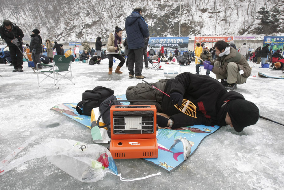 2010年1月9日,韓國華川郡,一年一度的華川山鱒魚節(jié)當(dāng)日舉行。數(shù)千游客在此“破冰”比賽釣鱘魚。該活動(dòng)每年都會(huì)吸引上百萬游客前來。