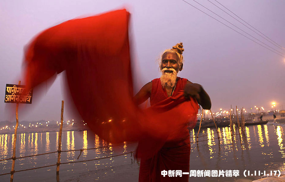 1月13日(周三),在印度阿拉哈巴德一年一度的佛浴節(Magh Mela)期間,一名印度教信徒在恒河沐浴后晾干衣服。圖片來源:中國新聞網