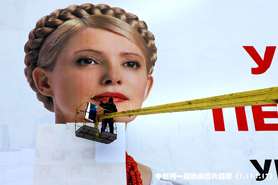 1月14日(周四),一名工人在基輔張貼烏克蘭總理季莫申科(Yulia Tymoshenko)的巨幅海報。她向選民承諾若當選總統,將修復烏克蘭與俄羅斯的關系。投票從本周日開始。圖片來源:中國新聞網