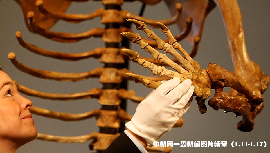 1月11日(周四),在倫敦,Bonhams拍賣行的工作人員正在查看一只冰河時(shí)期巨型熊的骨骼,其年代大約可追溯到5,000萬(wàn)年前。這具骨骼有望拍得3萬(wàn)至4萬(wàn)美元。圖片來(lái)源:中國(guó)新聞網(wǎng)