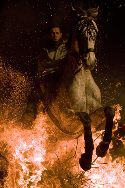 1月16日,西班牙一小村莊舉行一年一度的圣安東尼贖罪節,勇敢的騎士們騎上心愛的坐騎穿過熊熊燃燒的火堆。 圖片來源:中國新聞網