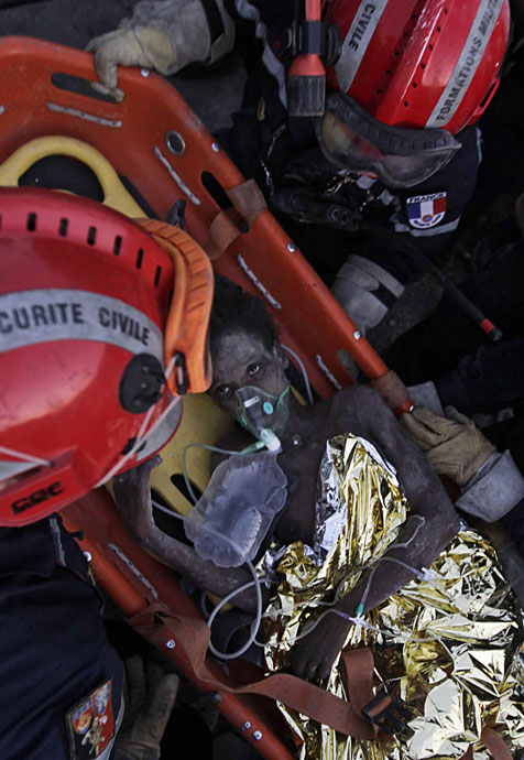 2010年1月27日,海地太子港,法國救援人員在一棟房屋的廢墟下救出被困15天的16歲女孩黛琳娜·艾提尼(Daline Etienne)。女孩微弱的話語讓大家著實吃驚:她竟是憑著隨身的可樂挺了過來。圖片來源:中國新聞網(wǎng)