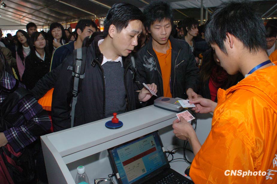 一年一度的春運(yùn)今日起正式開始。2010年的春運(yùn)從1月30日起至3月10日,為期40天,其中節(jié)前15天,節(jié)后25天。據(jù)權(quán)威預(yù)測(cè),今年春運(yùn)客運(yùn)量料超25億人次。圖為1月30日,廣州火車票實(shí)名制正式開始,乘客只需要將身份證和車票在驗(yàn)證設(shè)備上一刷,電腦上就能顯示出相關(guān)信息,核對(duì)之后,驗(yàn)票人員在車票上蓋章放行。中新社發(fā) 羅仰明 攝