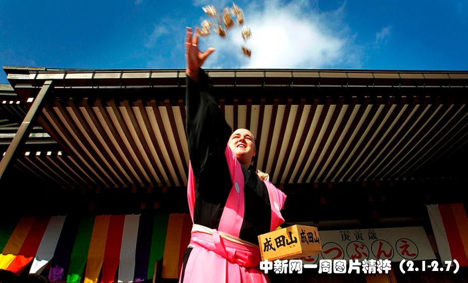 2月3日(周三),在日本千葉成田的一座寺廟,相撲新手、來自愛沙尼亞的巴魯托(Baruto)向人群拋撒袋裝的大豆。這種儀式通常在農歷新年進行,據說可以帶來好運。圖片來源:中國新聞網