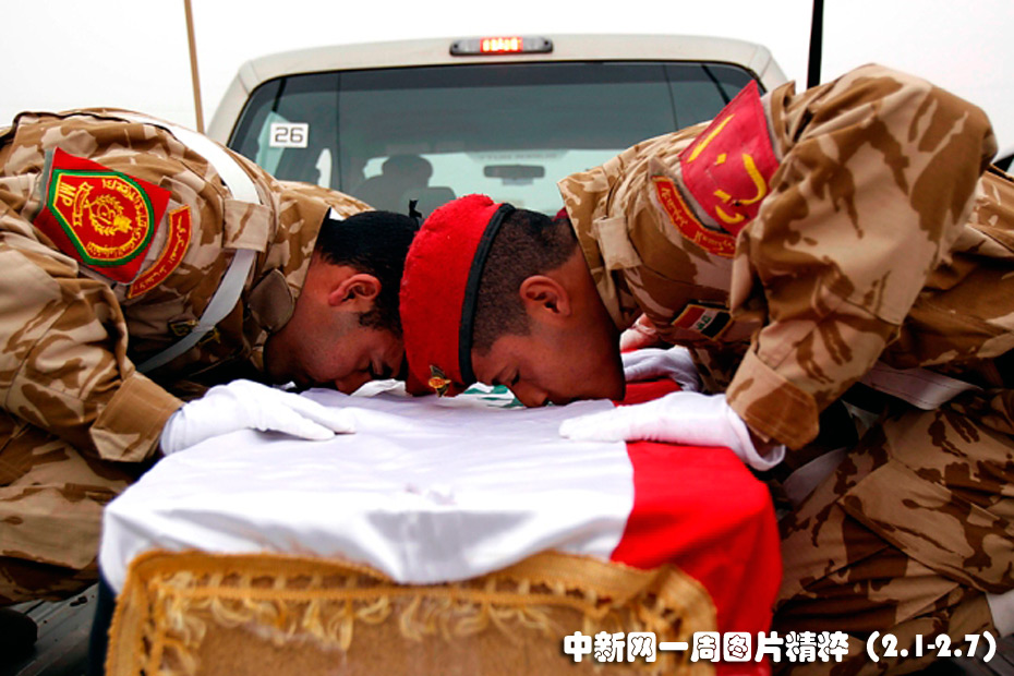 2月4日(周四),伊拉克士兵親吻一名同伴的靈柩,這名士兵的遺體在伊拉克巴斯拉附近的邊界處被交接。在兩伊戰(zhàn)爭(zhēng)中喪生的九名伊拉克人的遺體周四回到伊拉克。圖片來源:中國(guó)新聞網(wǎng)