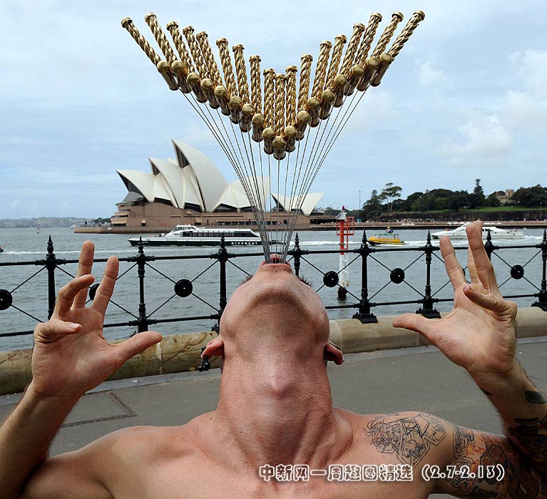 2月8日,街頭藝人Chayne Hultgren在澳大利亞悉尼海港大橋前,一次吞下18把厚約1.3厘米,長約50.8厘米的長劍,刷新了吉尼斯世界紀錄。圖片來源:中國新聞網(wǎng)>>點擊觀看詳細內(nèi)容