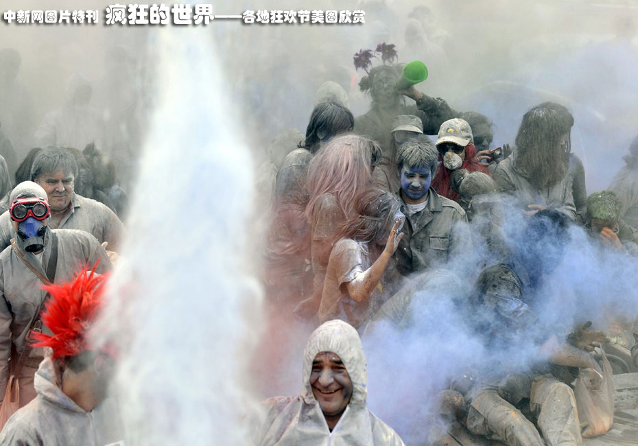 2月15日,希臘港口加拉西迪,狂歡者在街頭參加“面粉大戰”。圖片來源:中國新聞網