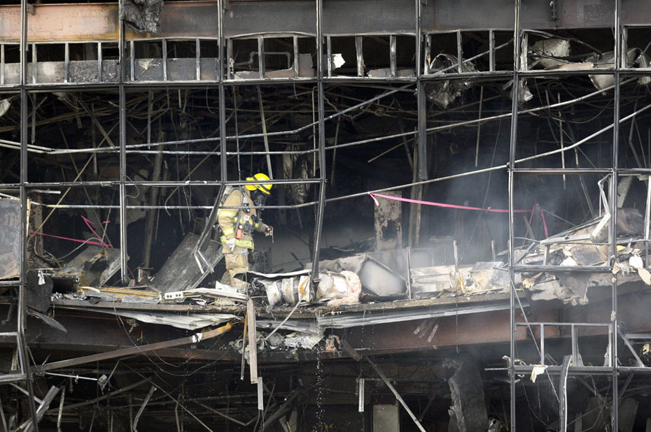 撞機(jī)事件導(dǎo)致大樓一面的幾十扇窗戶粉碎,一些樓層天花板塌陷,通過(guò)電視畫面,可以看到大樓二三樓層濃煙滾滾,黑煙中不時(shí)有竄出的火焰。