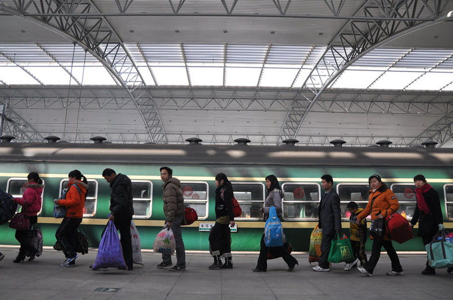 春節黃金周落幕,節日的氣氛漸漸淡去,各地春運相繼迎來返程客流高峰。圖為2010年2月19日,旅客在安徽阜陽火車站站臺排隊上車。盧啟建 攝
