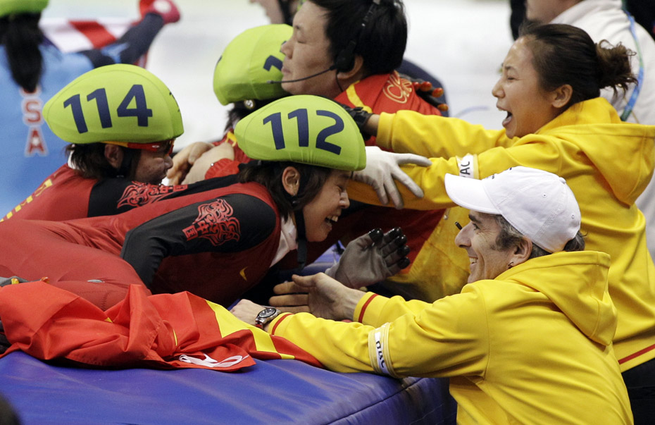 當?shù)貢r間2月24日,溫哥華冬奧會女子短道速滑3000米接力A組決賽中,中國隊王濛、周洋、孫琳琳、張會四朵金花聯(lián)袂出擊,最終將金牌歸入中國隊囊中。圖片來源:中國新聞網(wǎng)