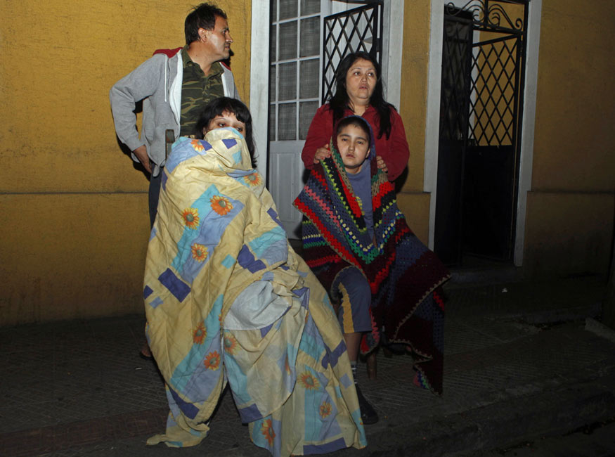 美國地震勘測局報告稱,智利康塞普西翁省附近當地時間27日凌晨發生里氏8.8級強烈地震,首都圣地亞哥有明顯震感。智利總統巴切萊特已宣布國家進入“災難狀態”。目前強烈地震造成的死亡人數已經升至78人。圖為在智利首都圣地亞哥,正在熟睡中的人們感到地震后紛紛走到戶外。