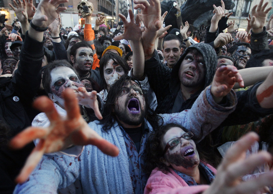 當地時間2月27日,在西班牙馬德里,眾多愛好者裝扮成“僵尸”的模樣,在街頭舉行巡游活動。