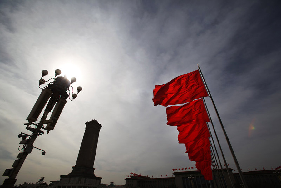 北京,兩會即將開幕,各項準備工作就緒。天安門廣場紅旗招展。Feng Li 攝