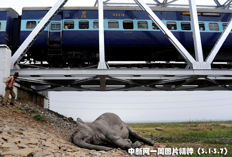 近日,印度高哈蒂的地坡湖野生動(dòng)物保護(hù)區(qū),一名警察正在查看一頭被火車撞死的大象。另有一頭懷孕大象生下一頭小象后帶著重傷逃離現(xiàn)場(chǎng)。工作人員救了這頭小象。圖片來源:中國(guó)新聞網(wǎng)