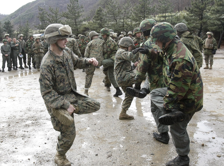 3月11日,在韓國鎮海海軍基地,韓美兩國的海軍陸戰隊舉行了聯合反恐軍事演習。