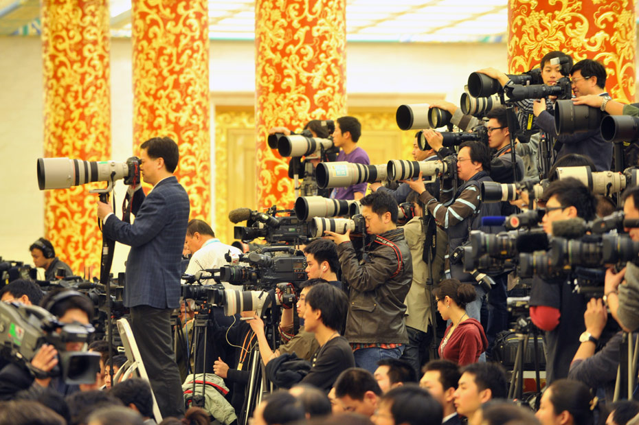 3月14日上午,國務院總理溫家寶在人民大會堂三樓金色大廳與采訪十一屆全國人大三次會議的中外記者見面并回答記者提出的問題。圖為現場記者。中新社記者 賈國榮 攝。圖片來源:中國新聞網