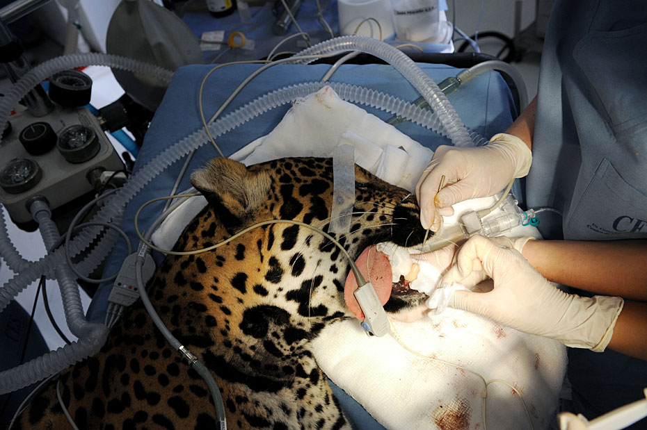 3月13日,在哥倫比亞麥德林附近的一個獸醫診所,一只雌性美洲虎在接受牙齒手術。圖片來源:中國新聞網