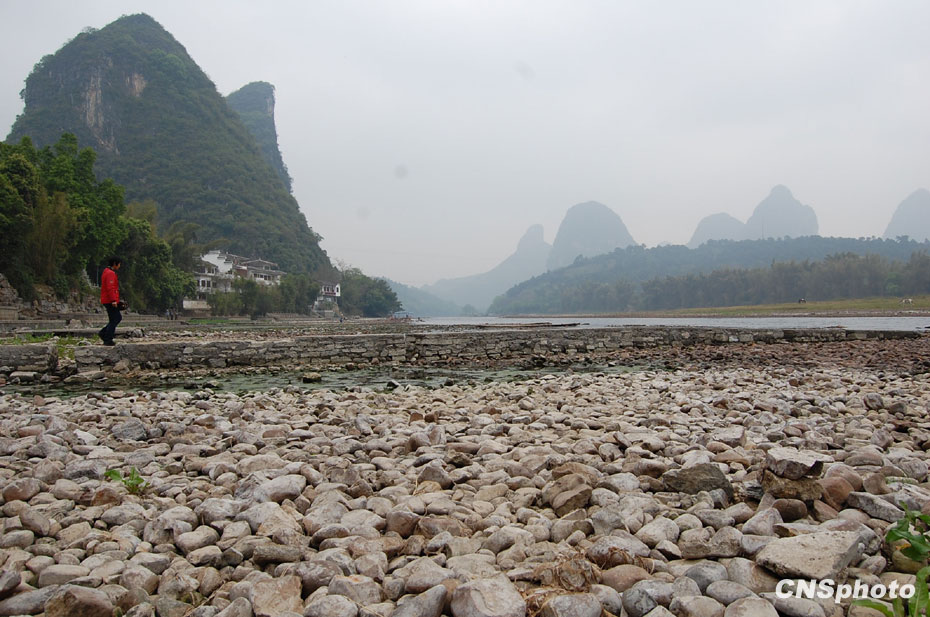 3月17日,受廣西50年不遇旱情影響,漓江水位持續下降,漓江游覽航線縮短。圖為陽朔碼頭露出河床的漓江。中新社發 諸葛保滿 攝