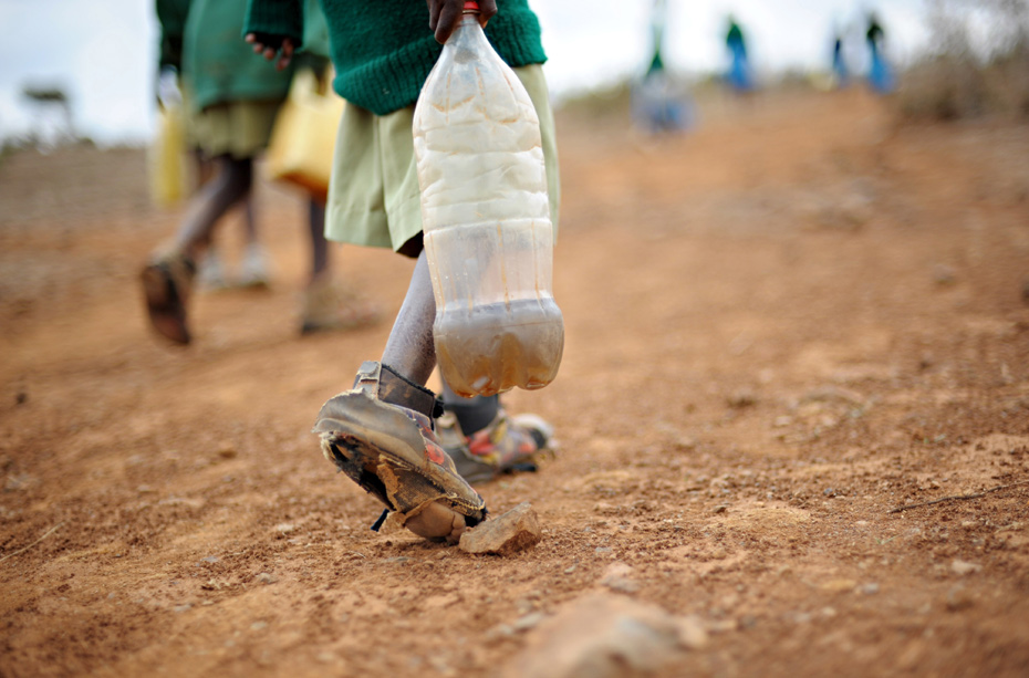 09年8月17,肯尼亞,一所學校的男孩穿著破舊鞋子,攜帶裝著河水的塑料瓶。