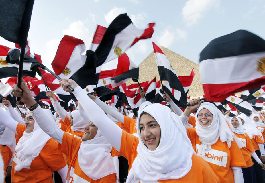 3月26日,4550名埃及兒童在首都開羅市郊的胡夫金字塔前揮舞埃及國旗,創(chuàng)造了在同一地點集體揮舞國旗的吉尼斯世界紀錄。