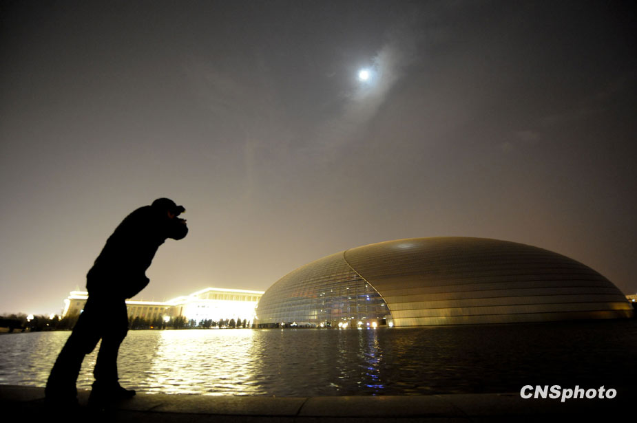 3月27日20點30分,北京國家大劇院關閉外景燈光,參與全球“關燈一小時”活動。圖為記者關注熄燈后的國家大劇院。中新社發 廖攀 攝