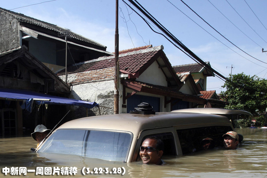 3月25日,印尼西爪哇的居民在洪水中推汽車。整個地區(qū)的河水泛濫后淹沒了村莊,迫使當?shù)鼐用耠x開家園。