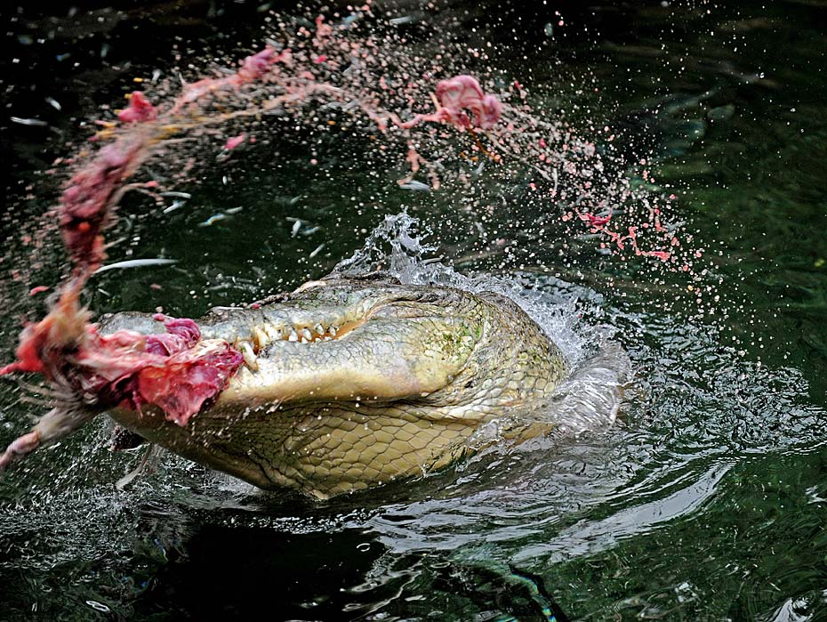 3月29日,澳大利亞悉尼野生動物園的一條鱷魚雷克斯正在享受它的美味——雞肉。圖片來源:中國新聞網