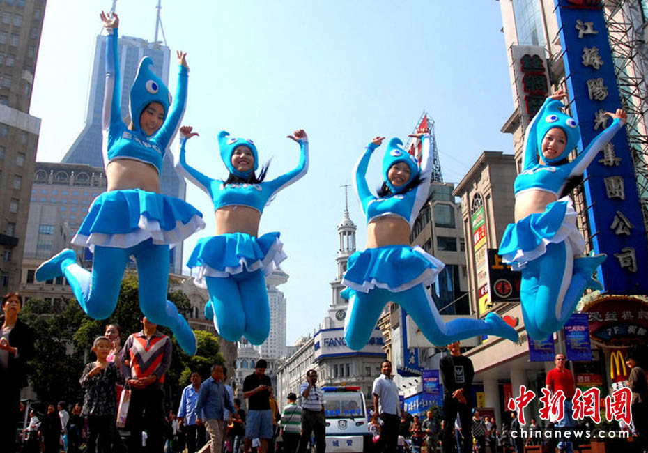 上海南京路步行街,幾名“海寶”打扮的少女出現在街頭,引起不少路人和游客的觀看。這是上海商貿旅游學校的女學生扮演的“歡樂海寶”,她們參加演出后,在街頭通過生動的形體語言來展示世博會的可愛吉祥物--“海寶”。 楊毅CFP