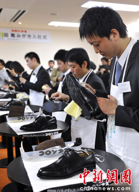 4月1日,日本一家鞋油廠新員工在入職儀式上為老員工擦鞋。圖片來源:中國新聞網