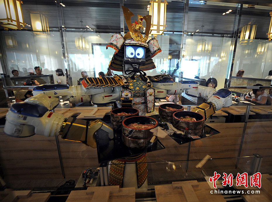 4月1日,在泰國首都曼谷的一家日本餐館使用機器人服務員為顧客端菜。圖片來源:中國新聞網(wǎng)