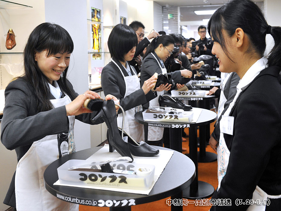 4月1日,日本一家鞋油廠新員工在入職儀式上為老員工擦鞋。圖片來(lái)源:中國(guó)新聞網(wǎng)>>點(diǎn)擊觀看詳細(xì)內(nèi)容