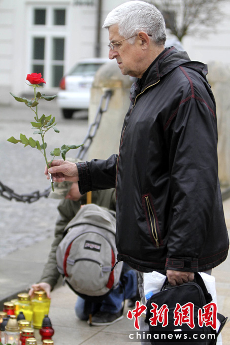 圖為波蘭華沙總統府前,有民眾拿著鮮花悼念身亡的總統。波蘭總統卡欽斯基乘坐的飛機10日在俄斯摩棱斯克失事,波蘭總統卡欽斯基已經確認死亡。有報道稱,飛機可能是在降落時被樹剮到,沒能在跑道上落地而墜落。不過亦有俄羅斯安全部門消息人士稱,人為失誤可能是造成波蘭總統專機墜毀的最主要原因。