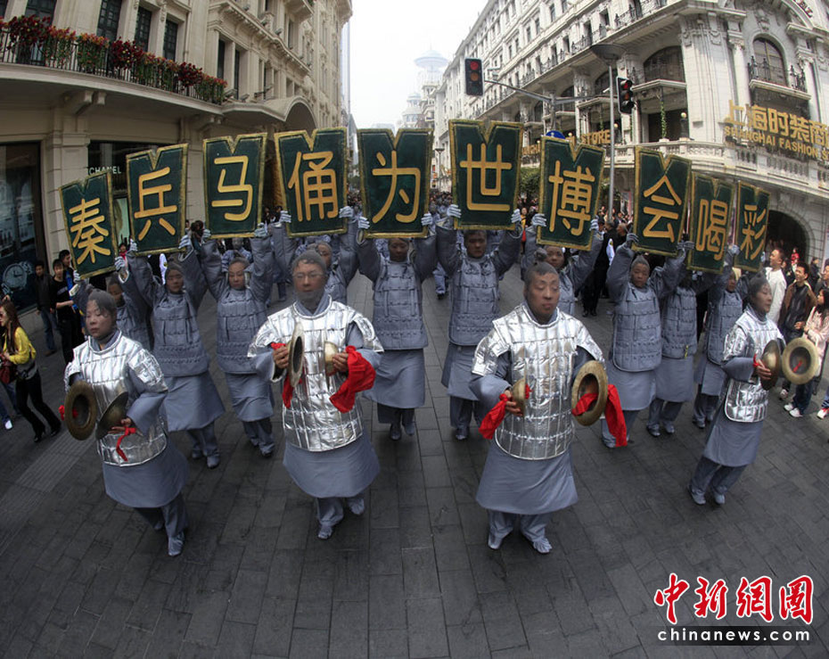 4月10日,由西安旅游局承辦的兵馬俑牽手上海世博會大型旅游宣傳咨詢活動舉行。來自兵馬俑故鄉(xiāng)的百人表演隊伍,身著灰色的兵馬俑服裝,以鏗鏘的節(jié)奏、雄壯的氣勢,在上海南京東路步行街和東方明珠廣場游演,吸引了大批市民及海內(nèi)外游客駐足觀看。文音/CFP
