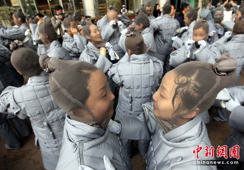 4月10日,由西安旅游局承辦的兵馬俑牽手上海世博會(huì)大型旅游宣傳咨詢活動(dòng)舉行。來自兵馬俑故鄉(xiāng)的百人表演隊(duì)伍,身著灰色的兵馬俑服裝,以鏗鏘的節(jié)奏、雄壯的氣勢,在上海南京東路步行街和東方明珠廣場游演,吸引了大批市民及海內(nèi)外游客駐足觀看。文音/CFP
