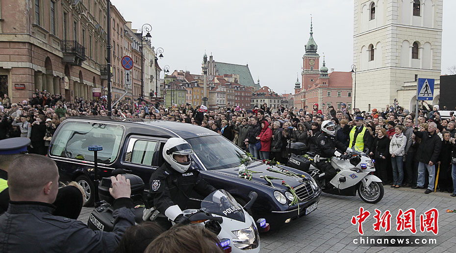 4月10日,卡欽斯基乘坐專機從華沙飛往俄羅斯斯摩棱斯克市,參加卡廷森林事件70周年紀念活動。途中飛機在斯摩棱斯克“北方”軍用機場附近降落時失事,共造成包括卡欽斯基夫婦及眾多政府高官在內的96人死亡。慘劇發生后,舉世震驚。圖為華沙市民迎接卡欽斯基“回家”。