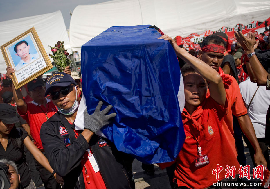 當(dāng)?shù)貢r間4月12日,泰國紅衫軍在曼谷市區(qū)抬著棺材舉行游行,借此向政府施壓促阿披實下臺。此前紅衫軍示威者與軍警發(fā)生沖突,造成21人死亡。圖片來源:中國新聞網(wǎng)